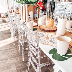 Set includes 8 Ghost chiavari chairs 1 White wood trestle table